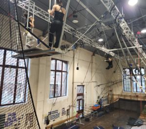 Cet atelier propose de se perfectionner à la pratique du trapèze grand-volant et du barre-à-barre, au départ de plateformes situées à 6 mètres de haut et accessibles par une échelle de corde. Les chutes se font dans un filet monté en début de cours et/ou démonté en fin de cours selon l’horaire du cours.